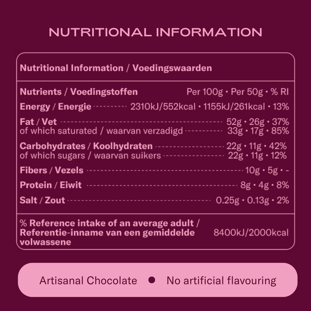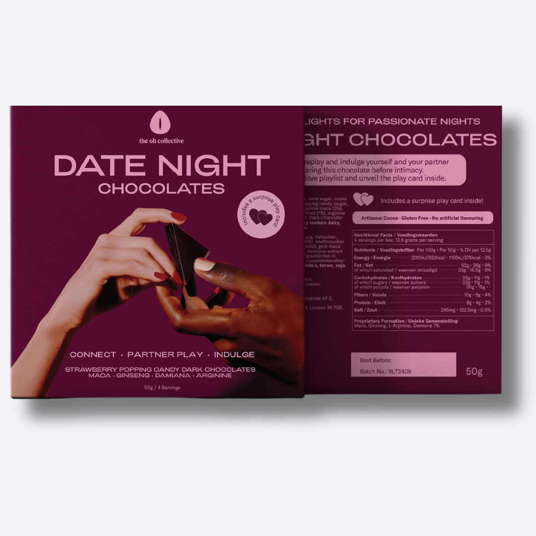 Onze Date Night Sex Chocolates bevatten natuurlijke ingrediënten die op kwaliteit zijn beoordeeld. Volg de aanbevolen portie. Ben je zwanger, geef je borstvoeding, gebruik je medicatie of heb je een aandoening, overleg dan met je arts.