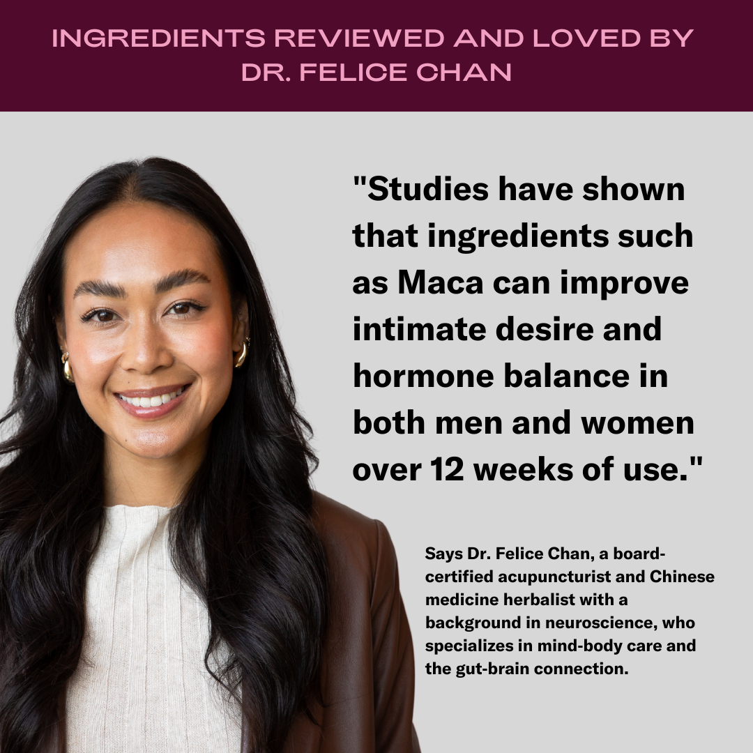 "Uit onderzoek is gebleken dat ingrediënten zoals Maca het seksuele verlangen en de hormoonbalans bij zowel mannen als vrouwen kunnen verbeteren gedurende 12 weken gebruik."